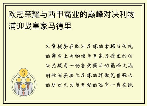 未来的欧冠四强对决,将会是各大豪门之间的顶级较量,曼城的表现无疑让他们成为夺冠的热门之一。然而,拜仁、皇家马德里等球队的竞争也不会轻松。接下来的比赛,必将成为整个欧洲足坛的焦点,悬念将一直持续到最后一刻。
